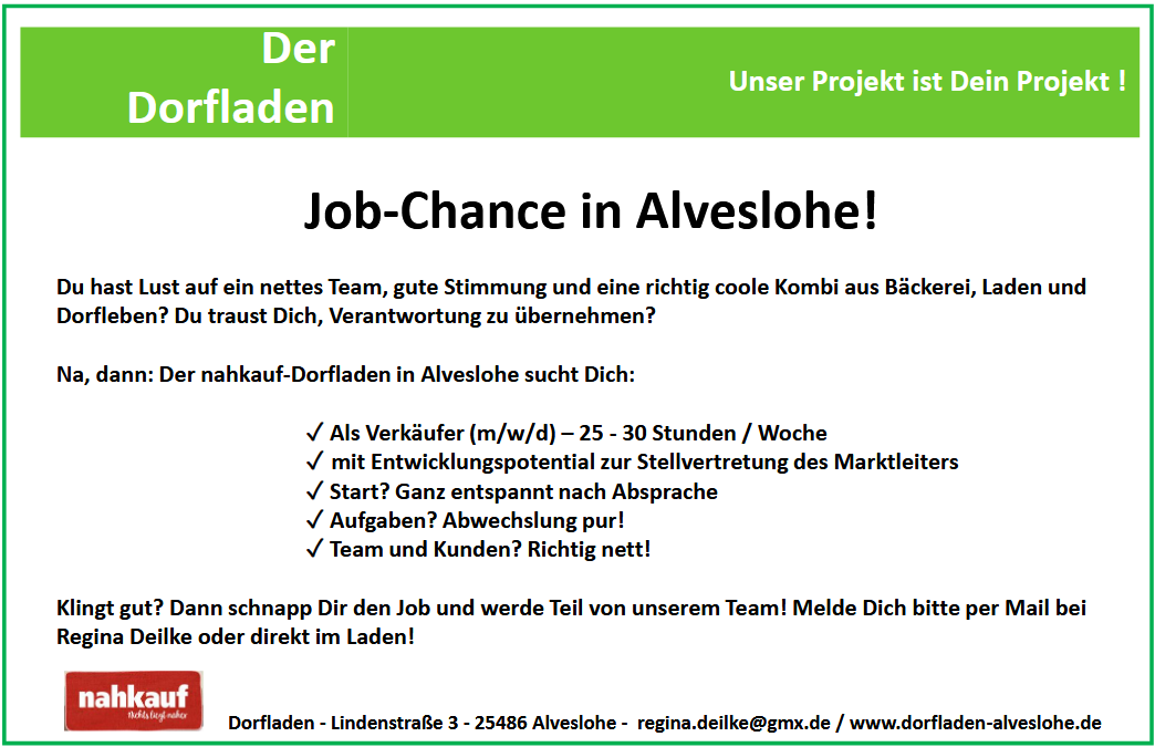 Suchen Sie nach einer Möglichkeit, sich für den Dorfladen und Alveslohe zu engagieren? Wir bieten Ihnen verschiedenste ehrenamtliche und berufliche Aufgaben!